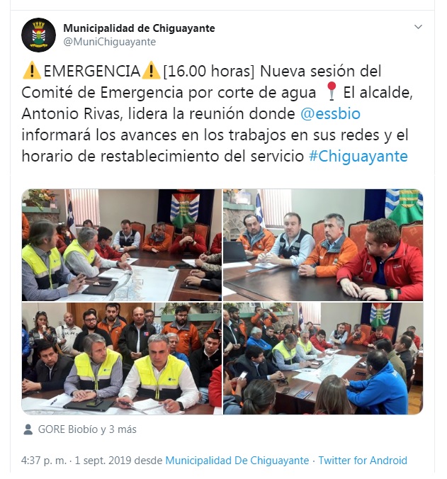 Tras el término del Comité de Emergencia, el intendente del Biobío y el alcalde de Chiguayante informaron que a las 19:00 se definirá si se suspenden las clases en la comuna por el corte de agua.