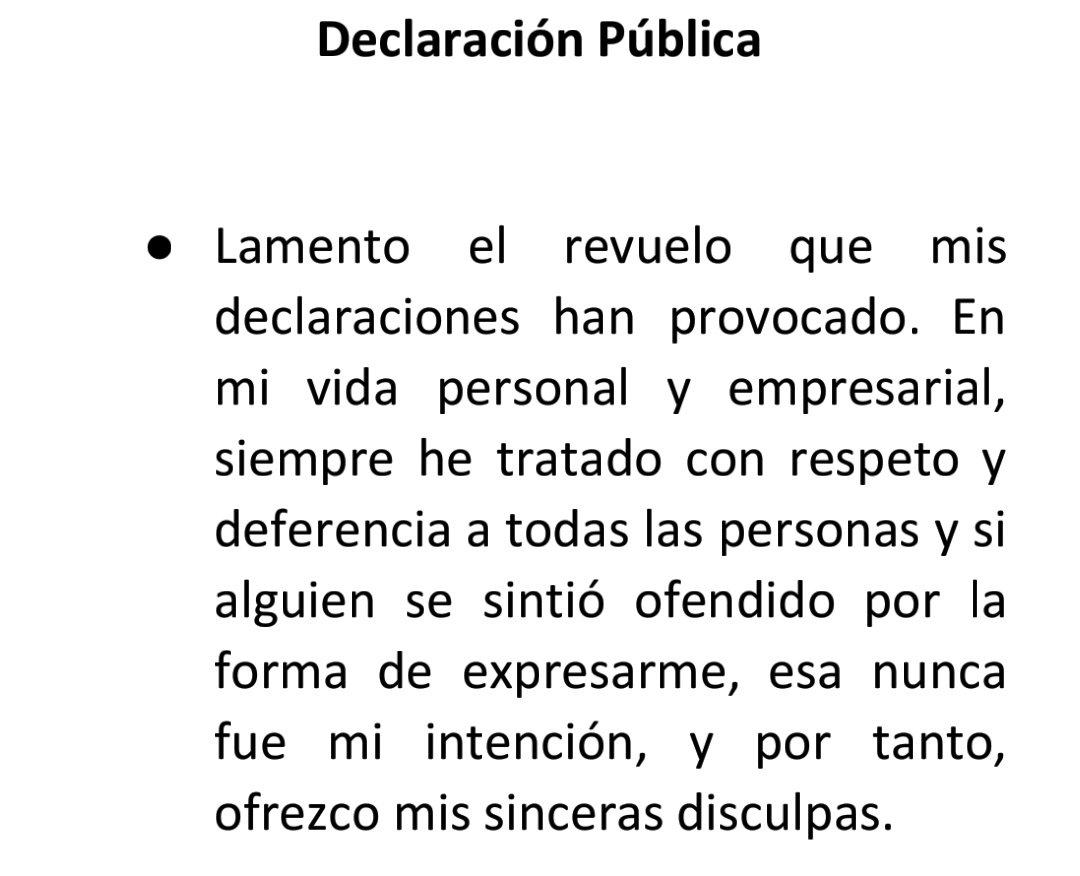 En ese sentido, señala que “en mi vida personal y empresarial, siempre he tratado con respeto y diferencia a todas las personas y si alguien se sintió ofendido por la forma de expresarme, esa nunca fue mi intención, y por tanto, ofrezco mis sinceras disculpas”.
