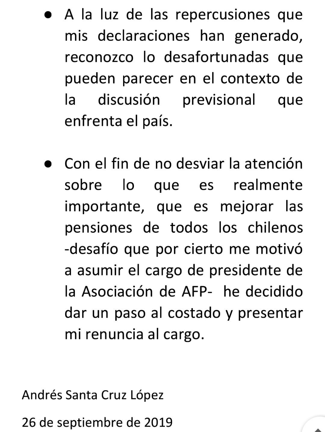 “Con el fin de no desviar la atención sobre lo que es realmente importante, que es mejorar las pensiones de todos los chilenos -desafío que por cierto me motivó a asumir el cargo de presidente de la Asociación de AFP- he decidido dar un paso al costado y presentar mi renuncia al cargo”, concluye.