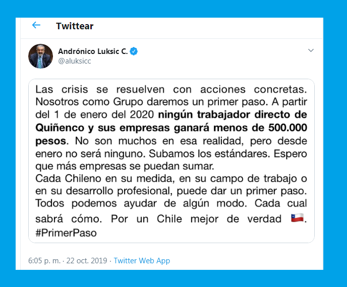 El empresario Andrónico Luksic ha hecho el siguiente anuncio que se adelanta a lo que anunciará el Presidente: “Las crisis se resuelven con acciones concretas. Nosotros como Grupo daremos un primer paso. A partir del 1 de enero el 2020 ningún trabajador directo de Quiñenco y sus empresas ganará menos de 500.000 pesos. No son muchos en esa realidad, pero desde enero no será ninguno. Subamos los estándares. Espero que más empresas se puedan sumar. Cada Chileno en su medida, en su campo de trabajo o en su desarrollo profesional, puede dar un primer paso. Todos podemos ayudar de algún modo. Cada cual sabrá cómo. Por un Chile mejor de verdad #PrimerPaso”, escribió el empresario en su cuenta de Twitter.