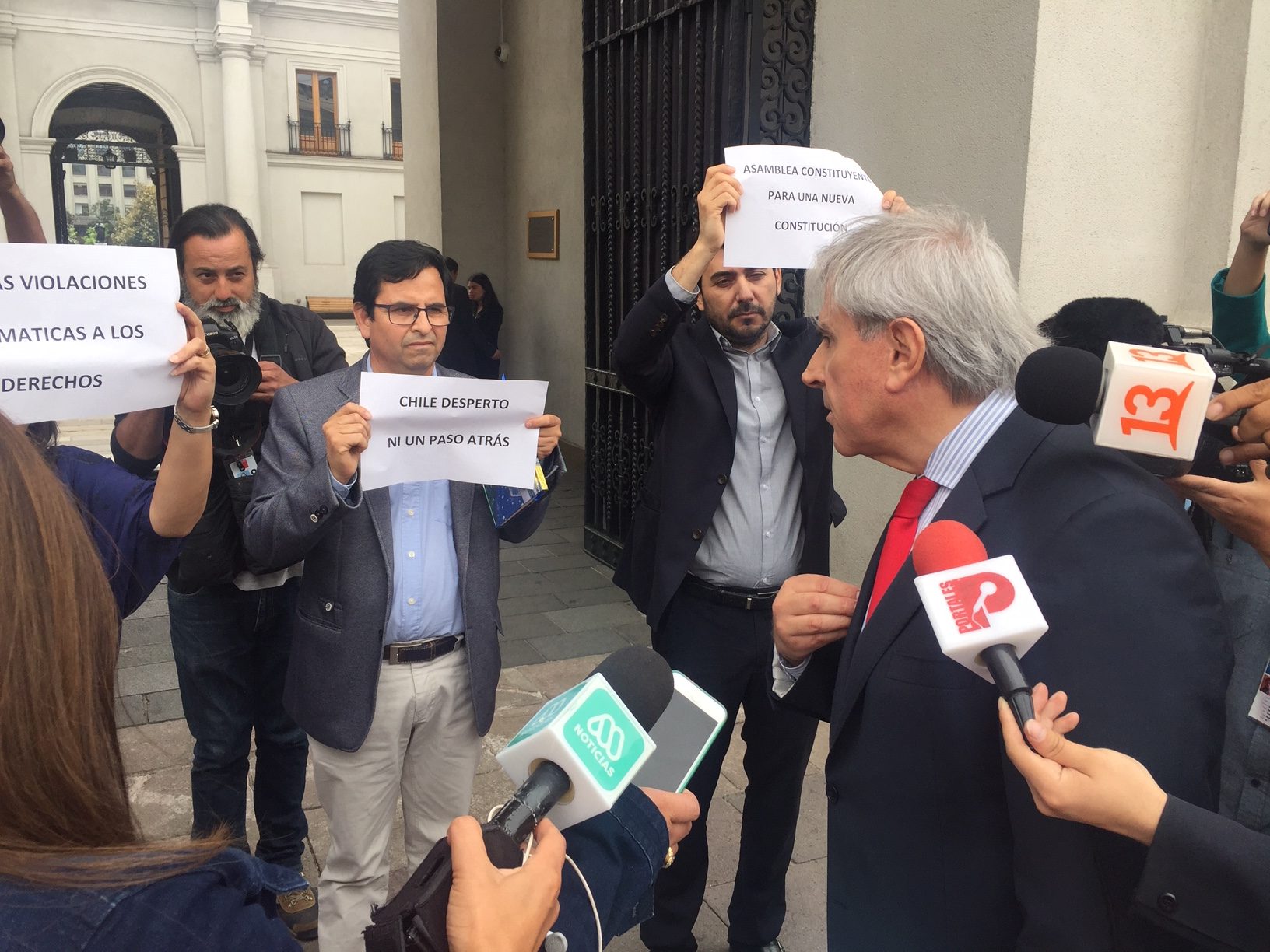 Las miradas, sin embargo pronto se fijaron a su retaguardia cuando tres representantes de la Asociación de Funcionarios de la Segpres y la Segegob se situaron a sus espaldas portando carteles alusivos a las movilizaciones ciudadanas: «No más violaciones sistemáticas a los derechos», «Chile despertó, ni un paso atrás», «Asamblea Constituyente para una nueva Constitución».
