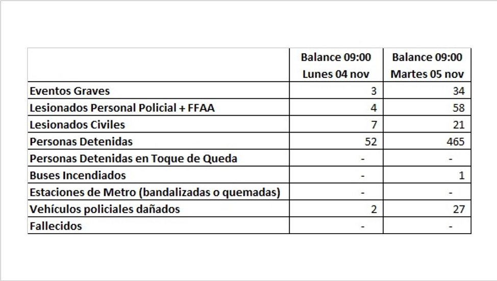 Además, hay 21 civiles heridos y 465 detenidos por diversos delitos. En esa línea, la autoridad comunicó que hubo 27 carros policiales afectados por piedras o elementos contundentes arrojados por manifestantes.