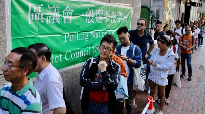 Las elecciones se celebraron en un ambiente de calma, sin altercados importantes, lo que se tradujo en una afluencia masiva de votantes a las urnas, con una participación récord del 71,2%, la más alta de la historia de Hong Kong.