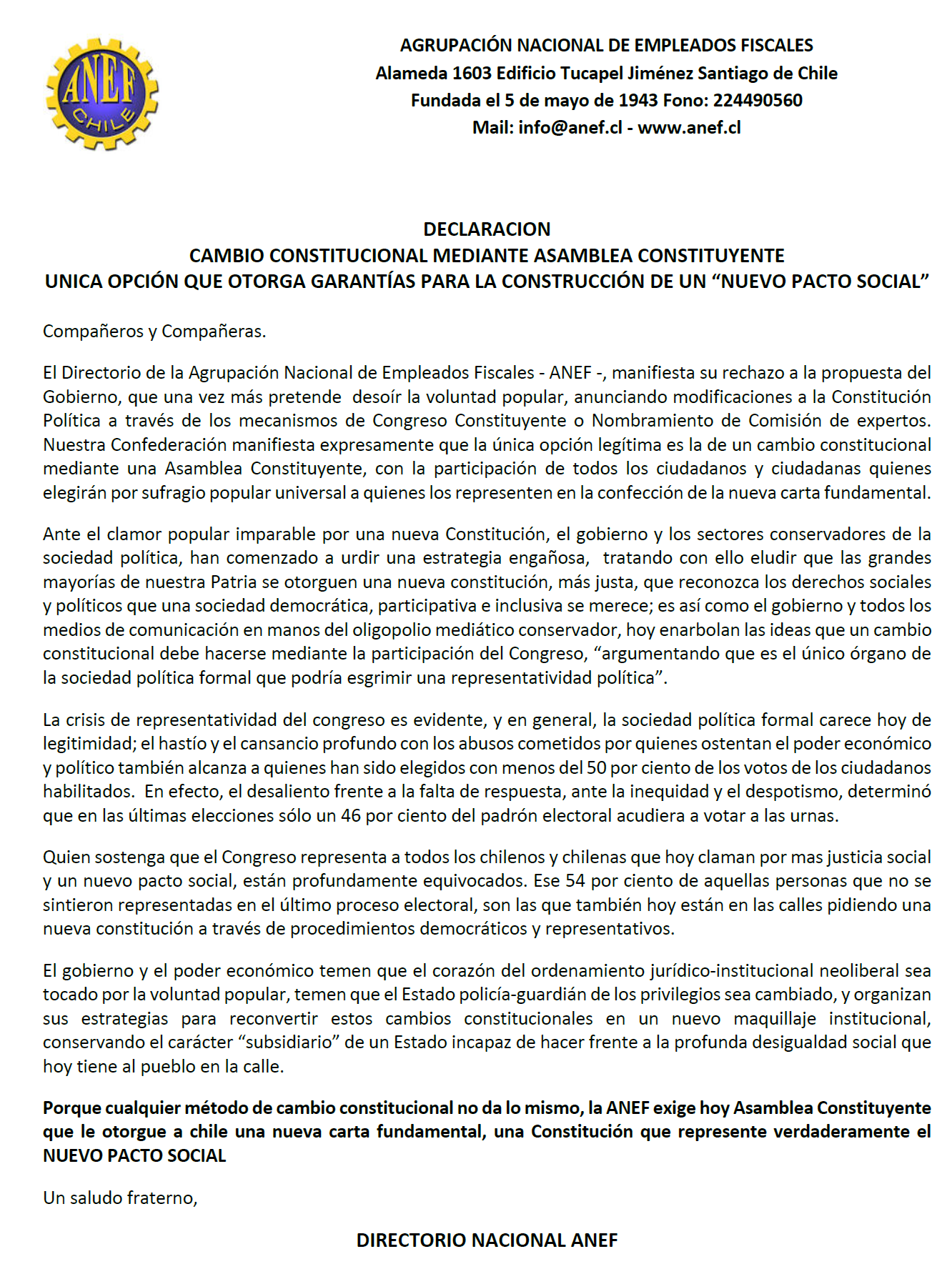 En tanto la ANEF también se unió a este petitorio, señalando que «el Directorio de la Agrupación Nacional de Empleados Fiscales – ANEF – manifiesta su rechazo a la propuesta del Gobierno, que una vez más pretende desoír la voluntad popular, anunciando modificaciones a la Constitución Política a través de los mecanismos de Congreso Constituyente o Nombramiento de Comisión de expertos. Nuestra Confederación manifiesta expresamente que la única opción legítima es la de un cambio constitucional mediante una Asamblea Constituyente, con la participación de todos los ciudadanos y ciudadanas quienes elegirán por sufragio popular universal a quienes los representen en la confección de la nueva Carta Fundamental».