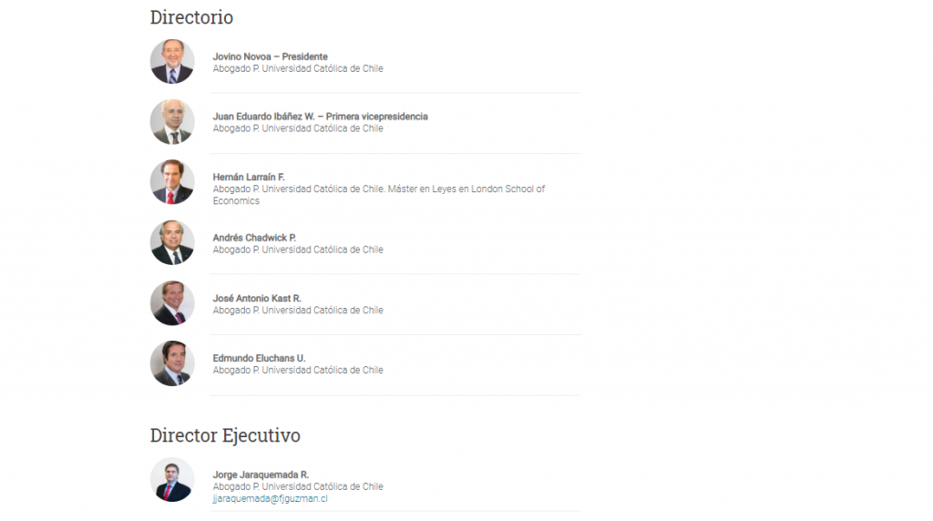 También aparecen en su directorio el actual ministro de Justicia, Hernán Larraín; el exministro del Interior, Andrés Chadwick; el líder del Partido Republicano, José Antonio Kast; el exdiputado UDI, Edmundo Eluchans y el abogado Juan Eduardo Ibáñez W.