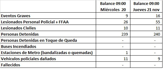 La subsecretaría del Interior dio a conocer este jueves un nuevo balance de las manifestaciones del miércoles, informando de incendios, saqueos y ataques a unidades policiales como también un aumento de la cantidad de funcionarios de Carabineros lesionados.