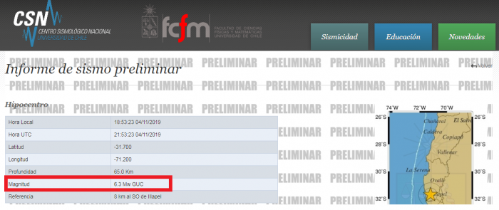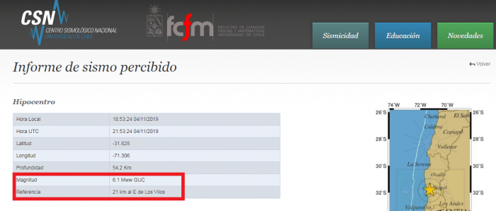 Este lunes 4 de noviembre, en el inicio de la tercera semana de movilizaciones por descontento social, a las 18:53:24 -según informa el Centro Sismológico Nacional de la Universidad de Chile-se percibió un sismo de intensidad mayor, que en el primer reporte alcanzó 6,3 grados de magnitud Richter y luego corrigió a 6,1°.