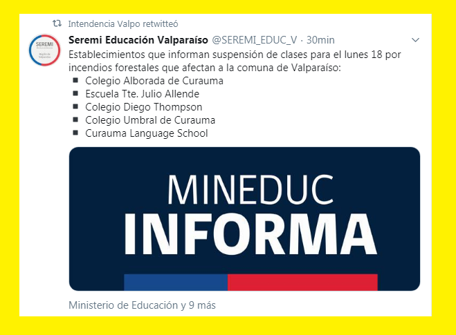 A las 18:35 horas la Seremi de Educación informó suspensión de clases para el lunes 18 por incendios forestales que afectan a la comuna de Valparaíso: