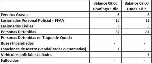 La subsecretaría del Interior entregó un nuevo balance de las últimas manifestaciones ocurridas el domingo, registrándose cinco eventos graves y una disminución en la cantidad de lesionados como un aumento en los detenidos.