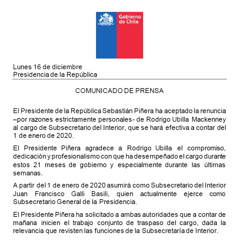 El gobierno acaba de anunciar esta tarde que aceptó la renuncia del subsecretario del Interior, Rodrigo Ubilla, la cual se hará efectiva a contar del próximo 1 de enero de 2020, fecha en la que lo reemplazará el actual subsecretario General de la Presidencia, Juan Francisco Galli.