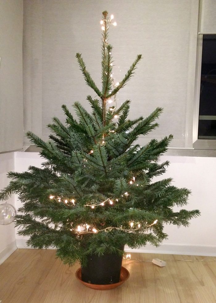 Árbol natural y sustentable: Para quienes gustan de los árboles naturales, una buena opción es tener un pino joven en macetas, este se puede colocar en una mesa de centro o en repisas que no roben mucho espacio, pero que sean visibles y llamativos. Durante el resto del año se puede cuidar del pino como cualquier otra planta de interior y reutilizarlo en años venideros cambiando los colores de las decoraciones y el lugar de exposición.