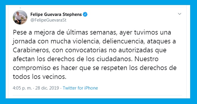 A las 16:05 de este sábado escribió: «Pese a mejora de últimas semanas, ayer tuvimos una jornada con mucha violencia, delincuencia, ataques a Carabineros, con convocatorias no autorizadas que afectan los derechos de los ciudadanos. Nuestro compromiso es hacer que se respeten los derechos de todos los vecinos».