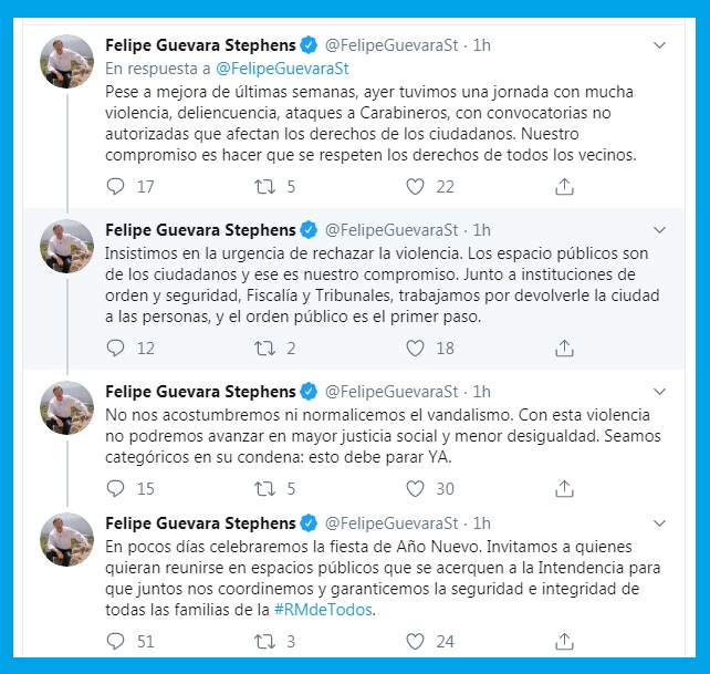 Este sábado 28 de diciembre y tras nuevos llamados de políticos y personeros de oposición y organizaciones sociales para que renuncie el intendente de la Región Metropolitana el RN Felipe Guevara, que ha implantado una férrea política policial en la Plaza Baquedano/Dignidad para evitar (lo que no ha ocurrido) que se el punto de reunión de las manifestaciones antisistema y antigobierno, salió al paso con un «hilo» de declaraciones a través de su cuenta de Twitter, la cual reproducimos íntegramente.