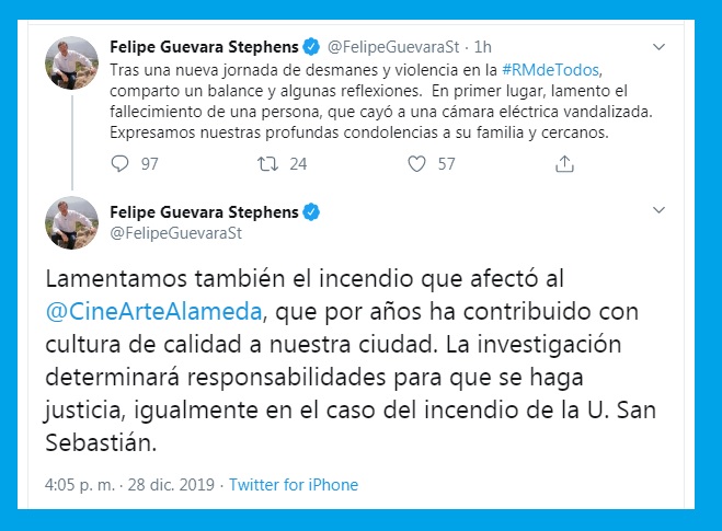 «Tras una nueva jornada de desmanes y violencia en la #RMdeTodos, comparto un balance y algunas reflexiones. En primer lugar, lamento el fallecimiento de una persona, que cayó a una cámara eléctrica vandalizada. Expresamos nuestras profundas condolencias a su familia y cercanos. Lamentamos también el incendio que afectó al @CineArteAlameda , que por años ha contribuido con cultura de calidad a nuestra ciudad. La investigación determinará responsabilidades para que se haga justicia, igualmente en el caso del incendio de la U. San Sebastián», escribió el intendente Guevara.