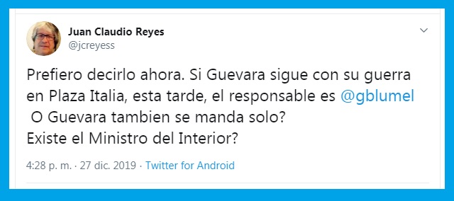 El sociólogo Juan Claudio Reyes escribió: «Prefiero decirlo ahora. Si Guevara sigue con su guerra en Plaza Italia, esta tarde, el responsable es @gblumel O Guevara tambien se manda solo? Existe el Ministro del Interior?»