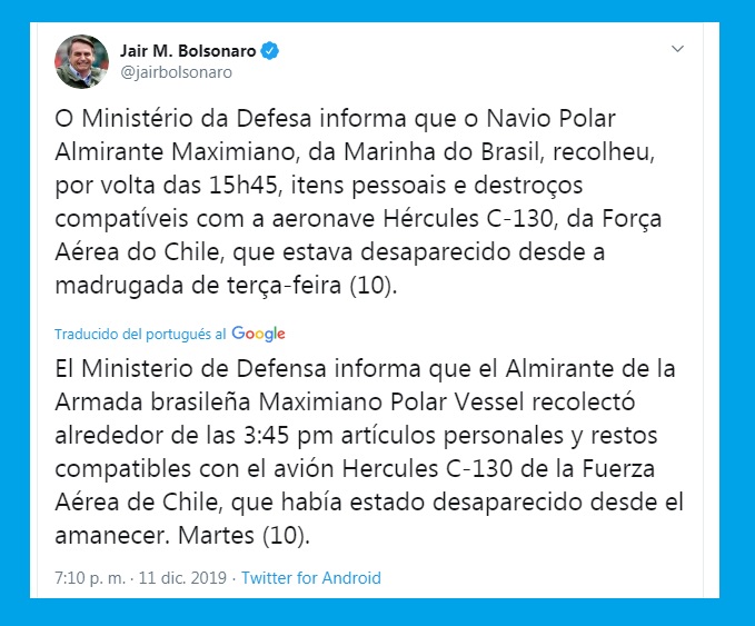 Esta información se conoce luego que el presidente de Brasil, Jair Bolsonaro anunciara por su cuenta twitter del hallazgo por parte del buque polar «Almirante Maximiano» de la Marina de dicho país, de restos del avión antes de que se informara de ello a la FACh, lo cual provocó la molestia de la institución de la defensa nacional, quien en un comunicado informó que «ante versiones de prensa y redes sociales, en las que se indica que se habrían encontrado nuevos restos que podrían pertenecer a la aeronave C-130 siniestrada, la Institución hace presente que por respeto a los familiares de las personas que viajaban en la aeronave, dicha información será analizada, validada y comunicada por la Fuerza Aérea de Chile”.