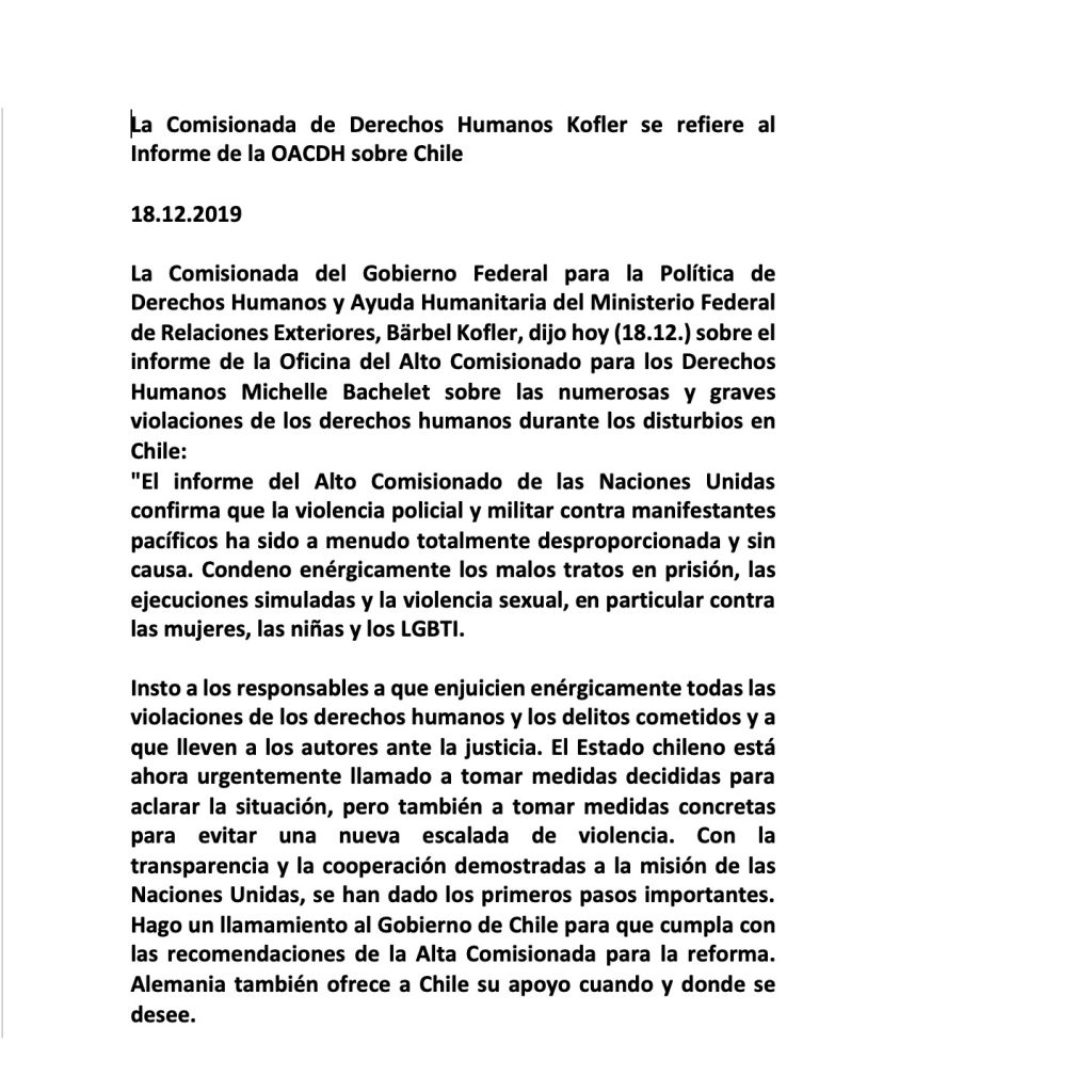 La petición la hizo a través de un comunicado de prensa la comisionada para los derechos humanos y asistencia humanitaria del Ministerio de Relaciones Exteriores germano, Bärbel Kofler, en el que comenta los resultados del informe elaborado por la Oficina de Alto Comisionado para los Derechos Humanos (Acnudh) sobre la crisis social chilena y sus conclusiones.