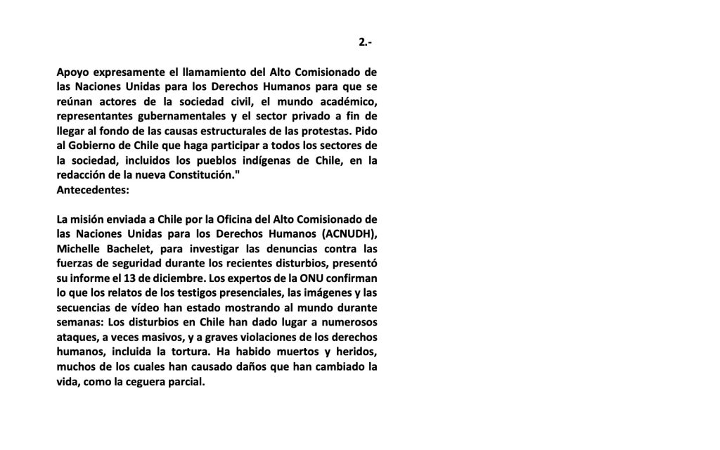 Y a renglón seguido menciona que “pido al Gobierno de Chile que haga participar a todos los sectores de la sociedad, incluidos los pueblos indígenas de Chile, en la redacción de la nueva Constitución”.