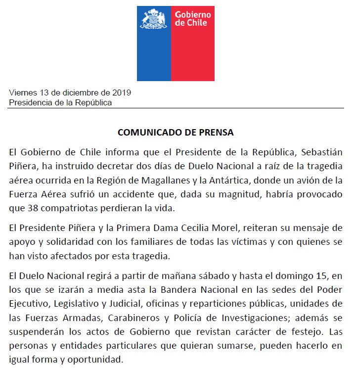 Haciéndose eco de las muestras de dolor y pesar causados por la muerte de 38 personas en el accidente del avión C-130 Hércules de la FACh que se dirigía a la Antártica, el Gobierno anunció en la tarde de hoy que decretó Duelo Nacional en memoria de las víctimas.