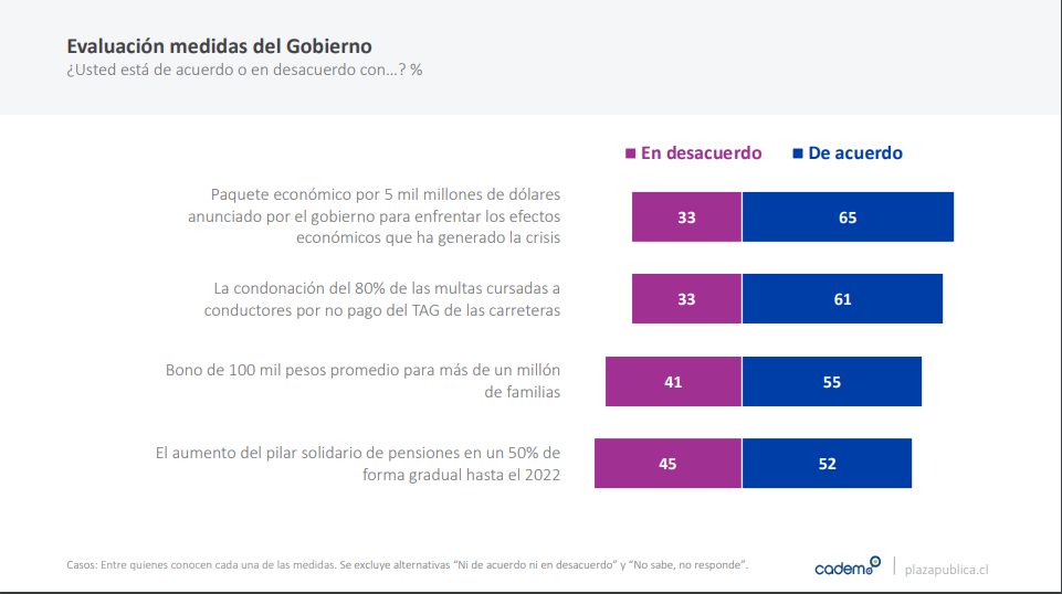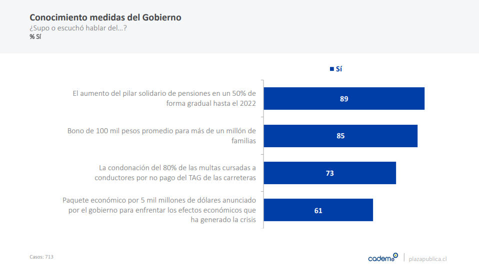Asimismo, el sondeo de opinión señala que un 89% supo o escuchó hablar del aumento del pilar solidario de pensiones en un 50% de forma gradual hasta el 2022, 85% del bono de 100 mil pesos promedio para más de un millón de familias, 73% de la condonación del 80% de las multas cursadas a conductores por no pago del TAG de las carreteras y un 61% del paquete económico por 5 mil millones de dólares anunciado por el gobierno para enfrentar los efectos económicos que ha generado la crisis.