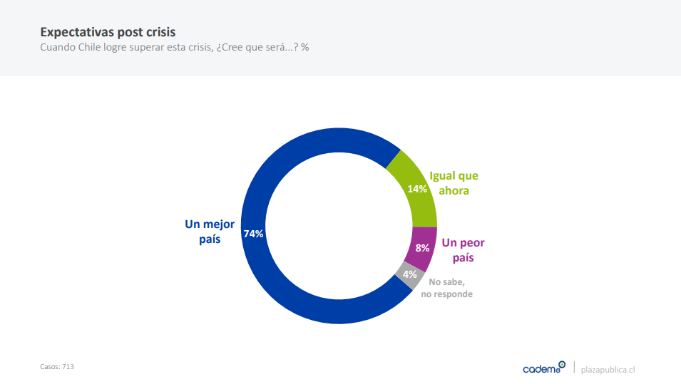 El estudio asimismo señala un 74% estima que el país será mejor cuando la crisis social termine, un 14% cree que será igual y un 8% que será un país peor al actual.