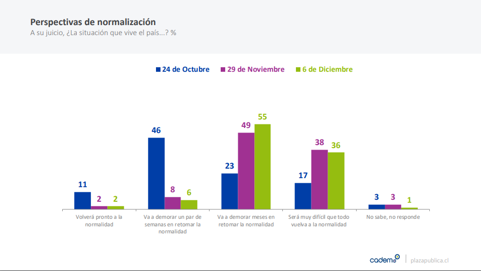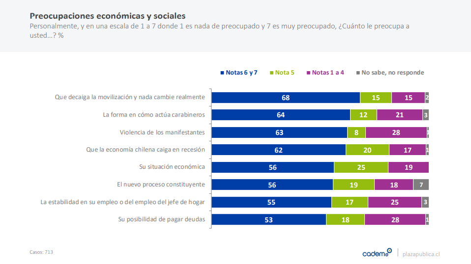 También sostiene que un 68% espera que la movilización decaiga y nada cambie realmente, un 64% le preocupa la forma en cómo actúa carabineros, un 63% la violencia de los manifestantes, un 62% que la economía caiga en una recesión, un 56% en el nuevo proceso constituyente, un 55% la estabilidad en su empleo o del empleo del jefe de hogar y un 53% en la posibilidad pagar las deudas.