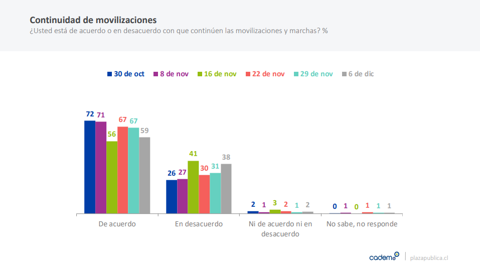 Otro punto importante es que un 59% esta de acuerdo en que las movilizaciones continúen, 8 puntos porcentuales menos que en noviembre pasado cuando marcó un 67%. Además, solamente un 38% está en desacuerdo con que las marchas sigan realizándose.