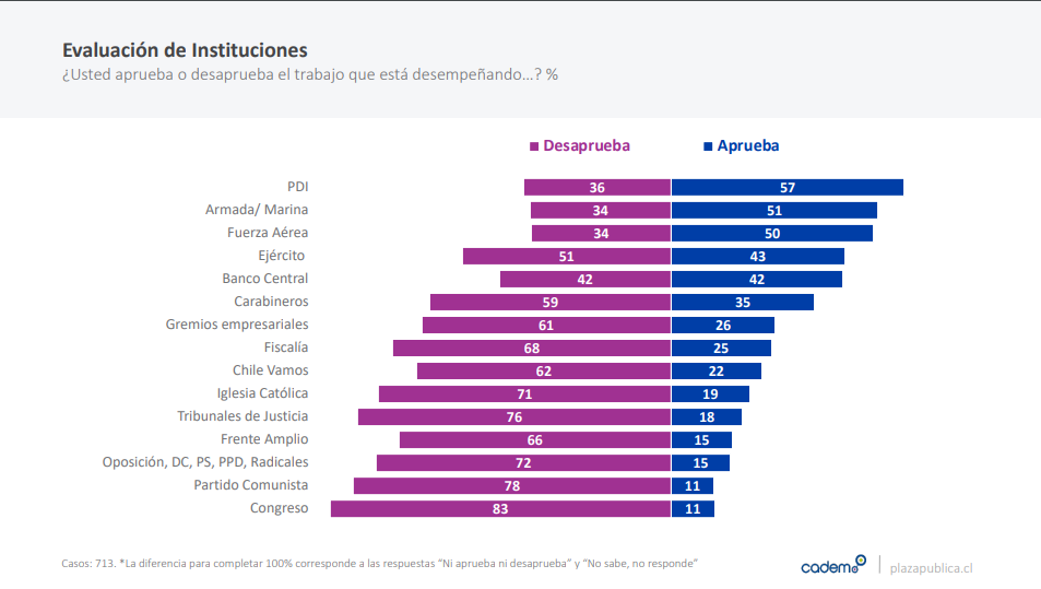 Dentro de los peores evaluados también figuran los tribunales de justicia con un 18%, la iglesia católica con un 19%. A su vez, la fiscalía registra un 25% de respaldo ciudadano.