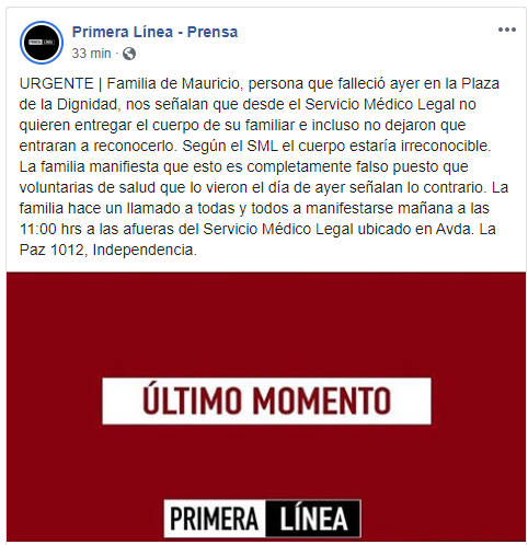 La familia de la victima hizo un llamado para que a las 11:00 horas se haga una manifestación fuera del SML para exigir la entrega del cuerpo, debido a que reclaman que aún no ha sido cedido y le han negado su reconocimiento, argumentando para ello lo irreconocible que está el cadáver del manifestante.
