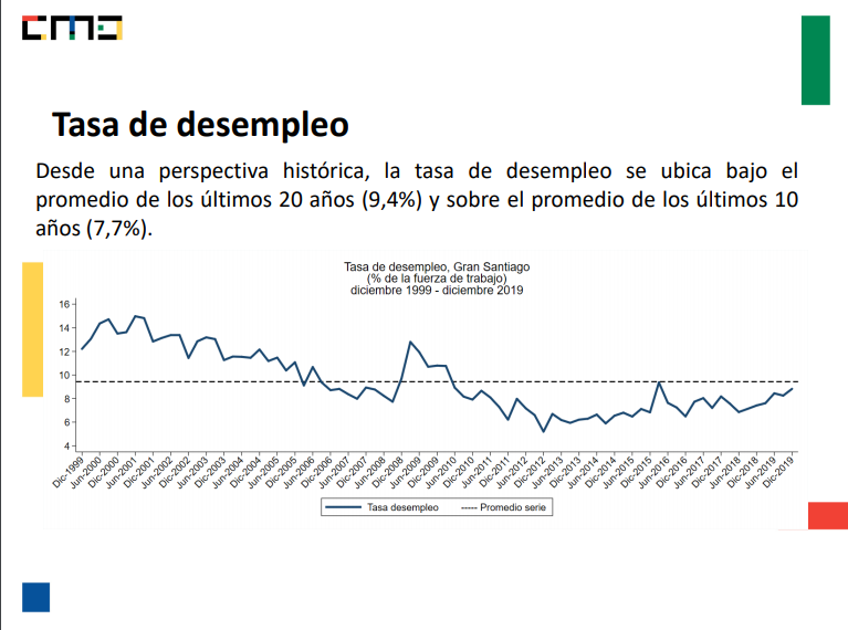 El estudio realizado por el Centro de Microdatos (CMD) en el Gran Santiago arrojó una tasa de desempleo de 8,8% que equivale a 296.331 personas desocupadas, cifra que representa un alza tanto respecto al trimestre anterior como a la de hace un año de 0,5 y 1,4 puntos porcentuales (pp), respectivamente.
