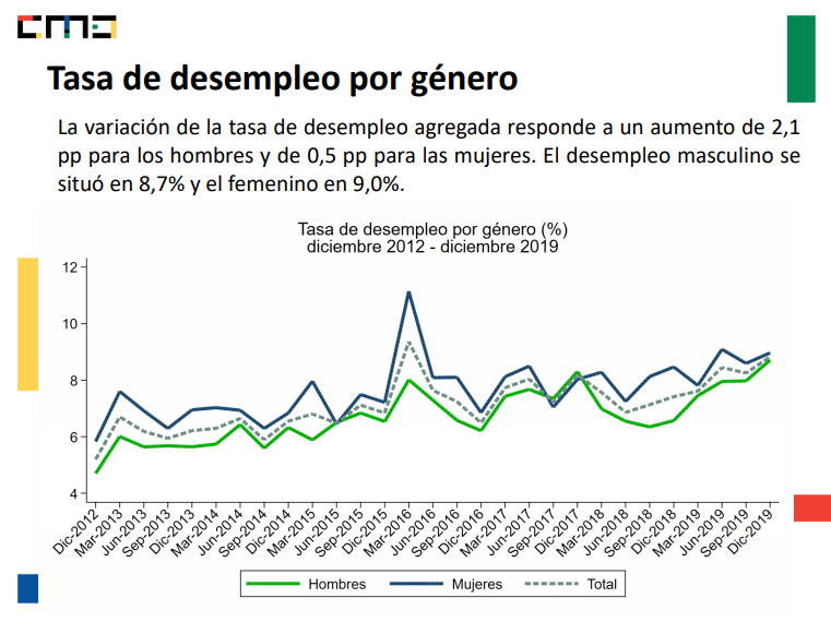 Al desagregar por género, el desempleo masculino llega a 8,7% y el desempleo femenino a 9,0%.