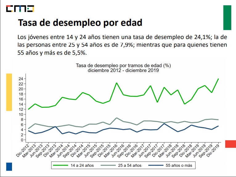 El desglose según grupo etario muestra que los jóvenes (14 a 24 años) presentan la tasa de desempleo más alta (24,1%) versus el grupo de quienes tienen de 25 a 54 años (7,9%).
