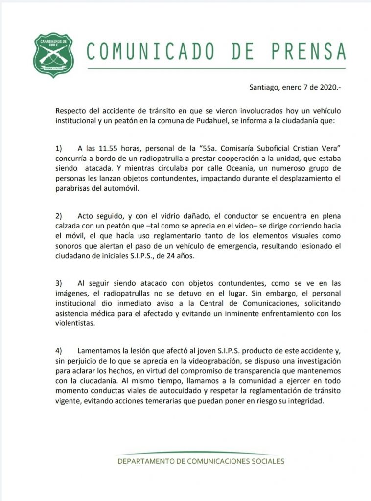 🔴 Declaración Pública a propósito de violento atropello a joven en Pudahuel por parte de Carabineros 🔴 pic.twitter.com/LV0ygPgw3a