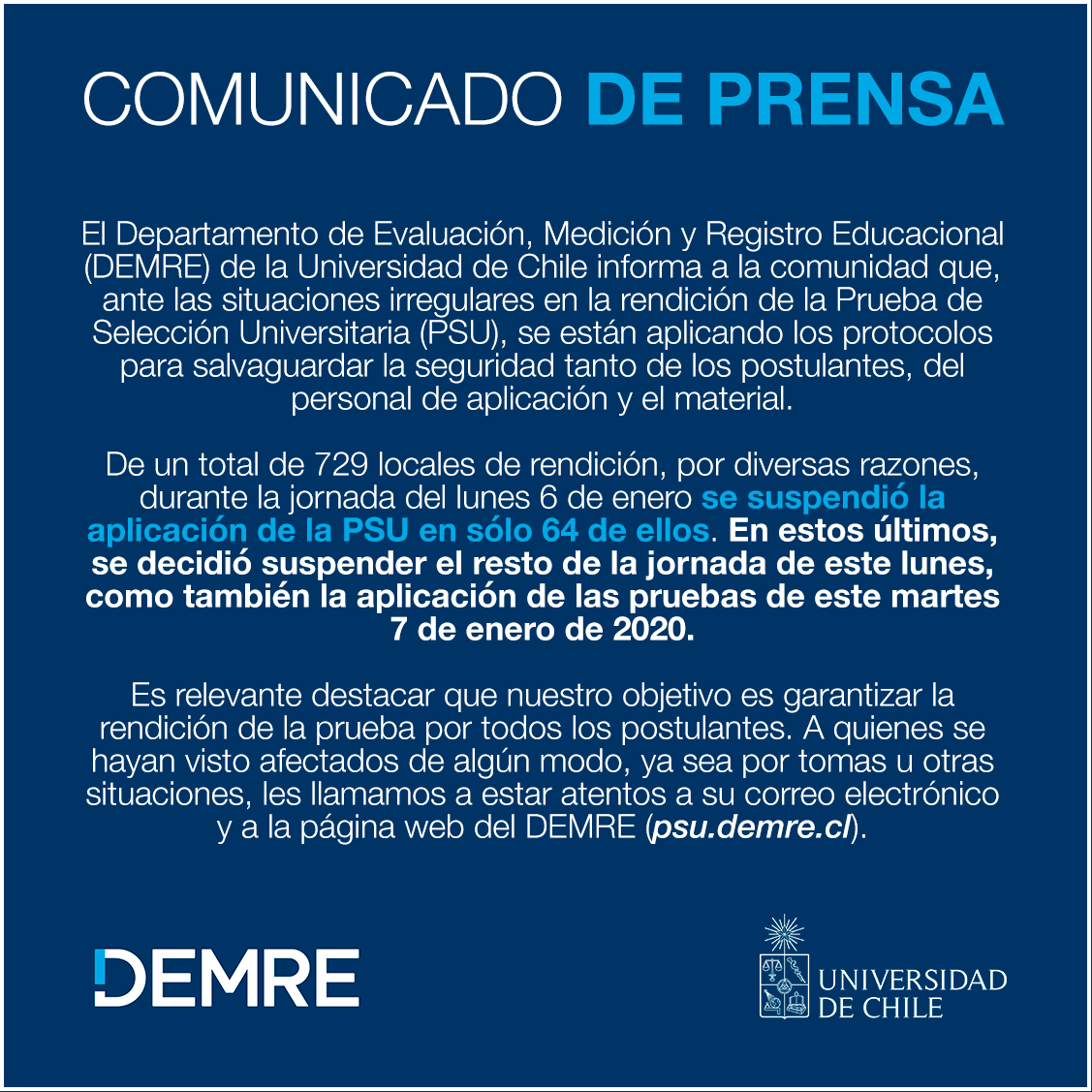 “Durante esta jornada del lunes 6 de enero se suspendió, por diversas razones, la aplicación de la PSU en 64 establecimientos que eran locales de rendición. Ante ello, el Demre decidió suspender el resto de la jornada de este lunes, como también la aplicación de las pruebas de este martes 7 de enero de 2020”, señala un comunicado.