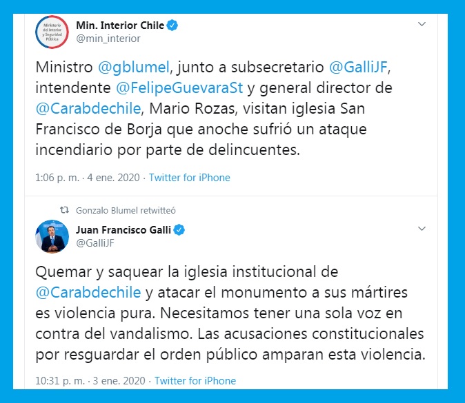 “Ministro @gblumel, junto a subsecretario @GalliJF , intendente @FelipeGuevaraSt y general director de @Carabdechile , Mario Rozas, visitan iglesia San Francisco de Borja que anoche sufrió un ataque incendiario por parte de delincuentes”, tuiteó el Ministerio del interior que comanda Gonzalo Blumel.