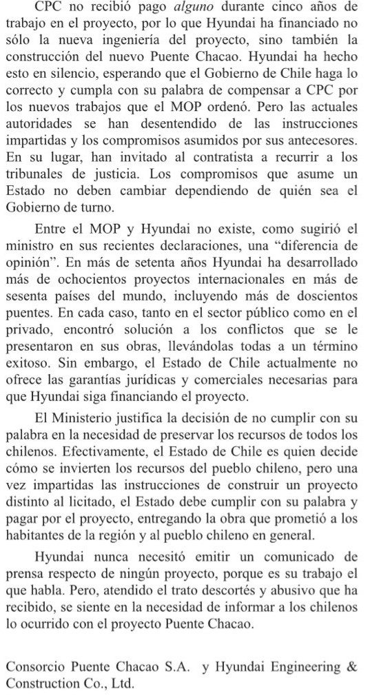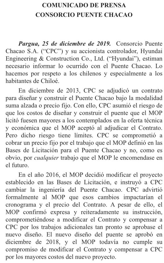 El lunes 23 de diciembre, Hyundai anunció que le era imposible seguir con las obras del Puente Chacao, acusando al MOP de mala fe, falta de seguridad jurídica y reiterados compromisos incumplidos.