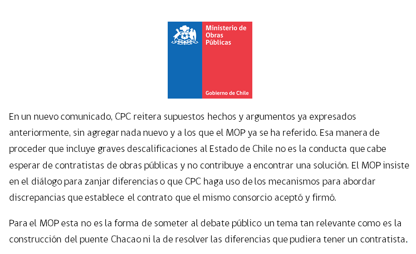 Agregó además que «el MOP insiste en el diálogo para zanjar diferencias o que CPC haga uso de los mecanismos para abordar discrepancias que establece el contrato que el mismo consorcio aceptó y firmó», instó, ya que -apuntó- «esta no es la forma de someter al debate público un tema tan relevante como es la construcción del puente Chacao ni la de resolver las diferencias que pudiera tener un contratista».