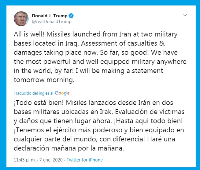 A las 23:45 de la noche de este martes -miércoles ya en los Estados Unidos- y a un par de horas del ataque iraní Nueve misiles cayeron el martes por la noche, miércoles, en la base aérea de Ein al-Assad en el oeste de Irak, donde están estacionados soldados estadounidenses, el Presidente Donald Trump reaccionó con un tuit que es considerado como un mensaje que no escale el conflicto: «¡Todo está bien! Misiles lanzados desde Irán en dos bases militares ubicadas en Irak. Evaluación de víctimas y daños que tienen lugar ahora. ¡Hasta aquí todo bien! ¡Tenemos el ejército más poderoso y bien equipado en cualquier parte del mundo, con diferencia! Haré una declaración mañana por la mañana».