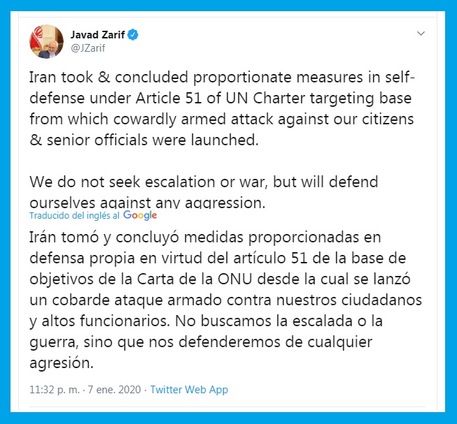 El mensaje de Trump, también es coincidente con el del canciller de Irán, Javad Zarif, quien escribió en su cuenta ooficial: «Irán tomó y concluyó medidas proporcionadas en defensa propia en virtud del artículo 51 de la base de objetivos de la Carta de la ONU desde la cual se lanzó un cobarde ataque armado contra nuestros ciudadanos y altos funcionarios. No buscamos la escalada o la guerra, sino que nos defenderemos de cualquier agresión».