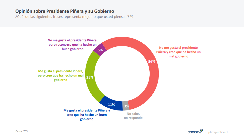 El sondeo señala que un 56% dice no gustarle el Presidente y que ha hecho un mal Gobierno, mientras que un 25% asegura gustarle Piñera, pero estima que ha hecho un mal Gobierno, mientras que un 11% asegura que le gusta el jefe de Estado y que ha hecho un buen Gobierno. Sin embargo, un 5% asegura que no lo gusta Piñera, pero reconoce que ha hecho un buen Gobierno.