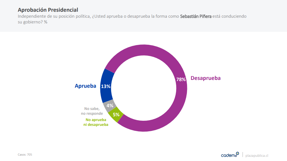 Sobre la aprobación presidencia, Piñera logra repuntar cuatro puntos y se posiciona en 13%. Hay que recordar que el mandatario había obtenido, en el último sondeo, la peor cifra de un jefe de Estado desde que se hace la medición con un 9%. A pesar del incremento, su desaprobación todavía se mantiene alta en un 78% de rechazo.