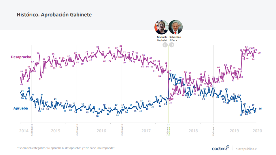 Respecto a la aprobación del gabinete, los ministros que acompañan al Presidente tampoco pueden subir mucho y solo lo hacen en dos puntos y llegan a un 16%, pero con una desaprobación de un 79%.