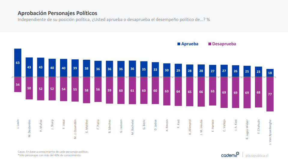 Sin embargo, en la parte alta de la tabla el alcalde de Las Condes, Joaquín Lavín, es quien aparece con mayor cantidad de aprobación con un 63% y solo un 34 de rechazo, siendo seguido por el presidente de RN y diputado, Mario Desbordes, quien se posiciona con 43% de aprobación, pero un 50% de rechazo.