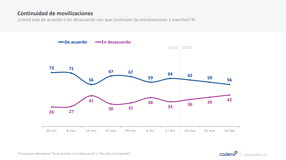 En cuanto a las movilizaciones que se han venido desarrollando desde el pasado 18 de octubre, un 56% se muestra de acuerdo en que las manifestaciones y marchas continúen, mientras que un 42% dice estar en desacuerdo.