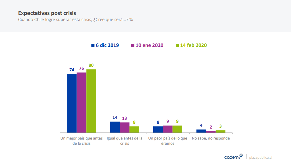 Sobre las expectativas que los chilenos tiene post crisis, el estudio apunta a que un 80% estima que Chile será un mejor país tras el estallido social y solo un 9 cree que será peor.