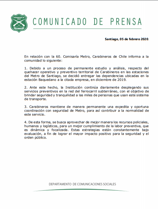 A través de un comunicado, Metro señala que “Carabineros comunicó a Metro la decisión de dejar el recinto ubicado al interior de la estación Baquedano, producto de lo cual el 13 de diciembre de 2019 se firmó la suspensión, de manera indefinida, del contrato de comodato que permitía emplazar la sextagésima Comisaría en dicho lugar”.