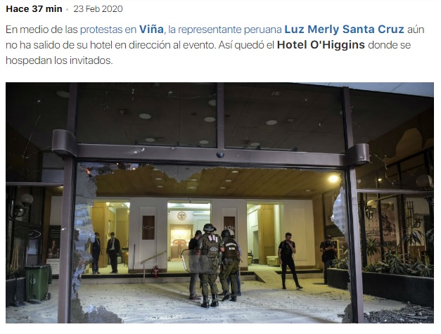 El medio peruano reportó además que: “En medio de las protestas en Viña, la representante peruana Luz Merly Santa Cruz aún no ha salido de su hotel en dirección al evento. Así quedó el Hotel O’Higgins donde se hospedan los invitados”.