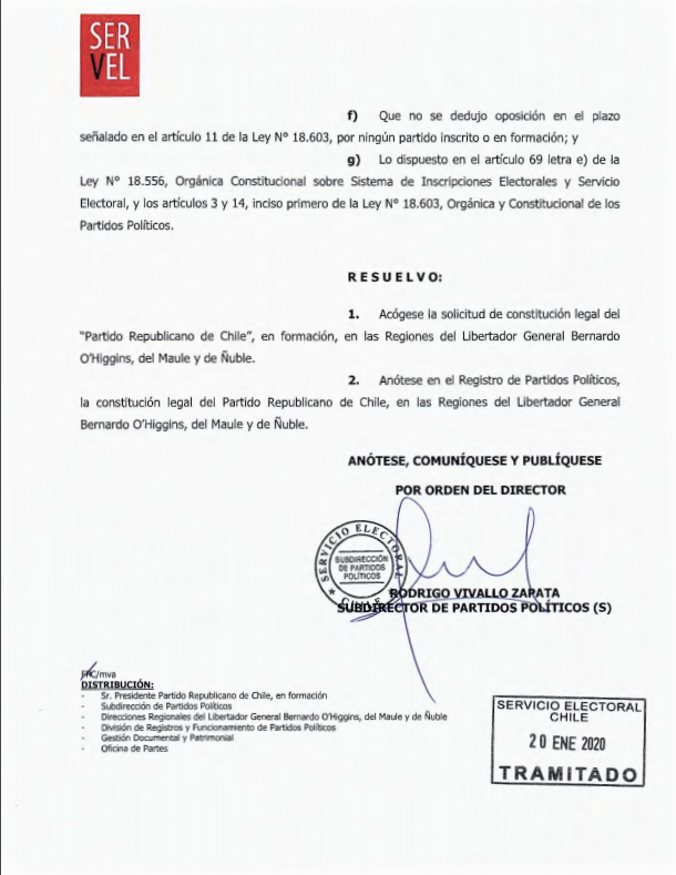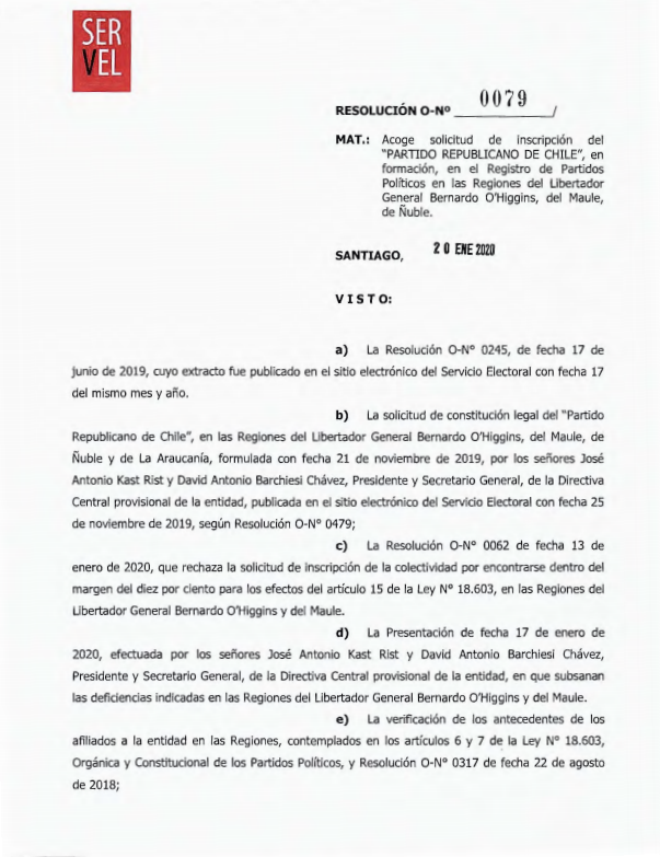 Y en el segundo considerando de la resolución se indica que “anótese en el Registro de Partidos Políticos, la constitución legal del Partido Republicano de Chile, en las Regiones del Libertador General Bernardo O’Higgins, del Maule y de Ñuble”.