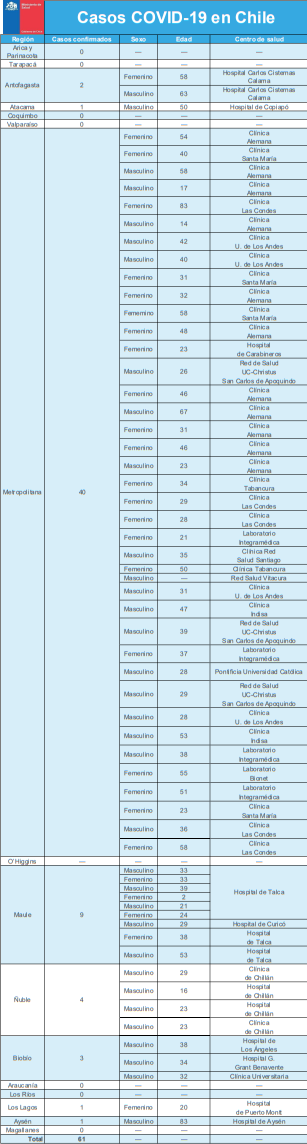 El nuevo informe entregado este sábado por el Ministerio de Salud señala que los casos de CORONAVIRUS llegan a 61 en Chile, siendo la primera vez que aparecen casos en el norte del país y un aumento de 18 en comparación al balance entregado el viernes en donde habían 18.
