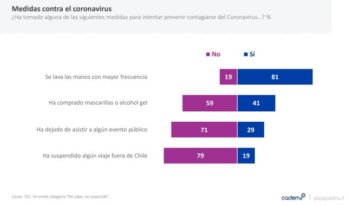 La encuesta incorporó preguntas relacionadas con la Pandemia: El 81% de los encuestados dice que “se lava las manos con Mayor frecuencia”. El 41% dice “haber comprado mascarillas o alcohol gel”. El 29% “ha dejado de asistir a algún evento público” y el 19% “ha suspendid algún viaje fuera de Chile”.